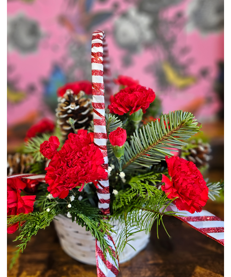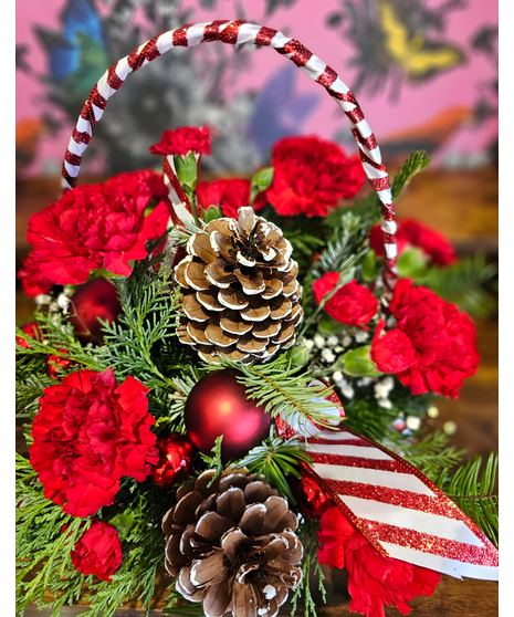 This enchanting arrangement brings together the festive colors of the season in a charming white woven basket. Brilliant red carnations pop against fragrant, fresh winter greens and feature charming pinecones and shimmering red ornaments.