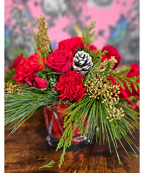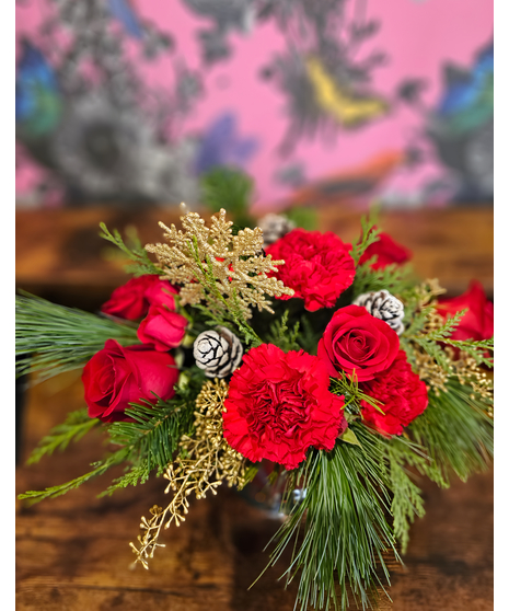 This isn't just a bouquet—it's a festive centerpiece that commands attention. Its robust colors and distinctive presentation make it the perfect way to bring bold, beautiful holiday rhythm into any space.
