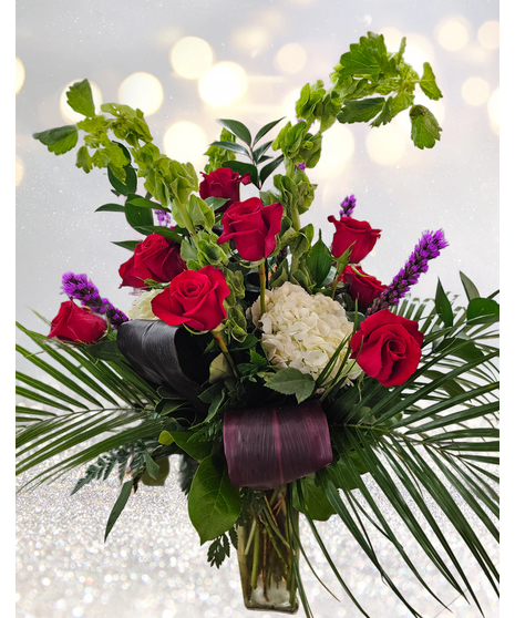 Crimson Heights is a modern, architectural take on the classic Valentine’s bouquet. Striking red roses are nestled among lush, tropical palm fronds and vibrant Bells of Ireland, creating a stunning silhouette that commands attention. Touches of deep purple and crisp white hydrangea add layers of sophisticated texture, making this the perfect "statement piece" for a home or office.
