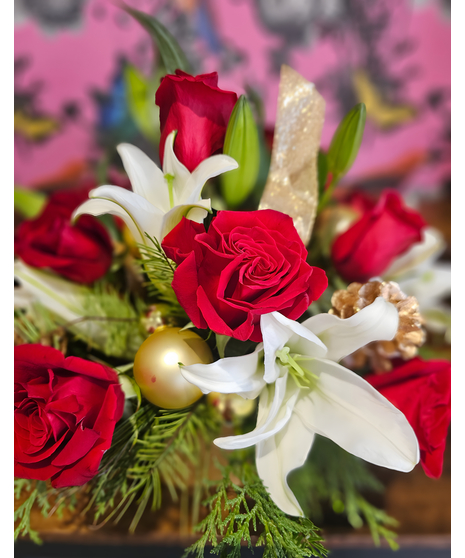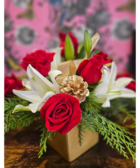 Nestled in a chic gold-toned cube, the lush blooms are accented by fragrant winter greens and sparkling gold accents and ornaments, giving a refined, luxurious touch. The striking contrast of deep red and brilliant white, frosted with shimmering gold, transforms this cube into a breathtaking centerpiece, perfect for bringing holiday glamour to any home or office. It’s a magnificent gift for those who appreciate classic beauty and festive style.