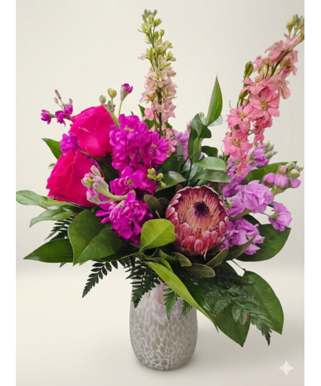 Ignite her space with the electric energy of Fuchsia Fire. This high-impact arrangement is a masterclass in bold color, featuring saturated magenta roses and velvety stock that pop against a dramatic backdrop. At its heart sits a majestic Protea, surrounded by the soaring heights of pink larkspur and the delicate textures of lavender blooms. The arrangement is artfully presented in a stunning white iridescent vessel. Each hand-blown vase features a unique iridescent finish, making it a one-of-a-kind gift and a beautiful addition to any space. It’s a fearless, modern tribute designed for the woman whose passion and spirit light up every room.