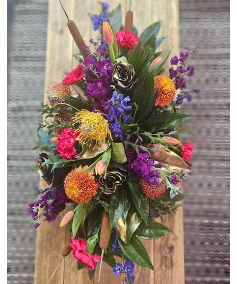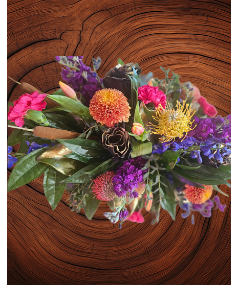 This grand centerpiece is designed with dramatic height and deep textures, making it the perfect focal point for a long dining table. It features a stunning palette of vibrant hot pinks, sunset oranges, and rich purples. Eye-catching elements include unique, architectural flowers like the spiky protea, dramatic dried cattails, and sophisticated, gold-tipped roses. A touch of metallic gold foliage woven throughout gives the arrangement its "golden" namesake and adds a celebratory, opulent shimmer. With its complex mix of black roses, carnations, chrysanthemums, and delphinium, this piece offers an unforgettable display of rustic grandeur and holiday spirit. This is perfect for large gatherings - tables with 12 - 20 guests or perfect for a buffet table