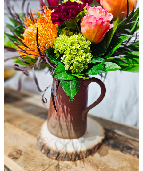 A stunning blend of modern style and rustic charm, The Harvest Pitcher is the perfect centerpiece for your fall celebrations. This design showcases dramatic orange protea as the star, surrounded by soft peach roses and rich burgundy blooms. Accented with textured green hydrangea and graceful ornamental grasses, the arrangement feels both natural and sophisticated. All flowers are thoughtfully arranged in a rustic terra-cotta pitcher, making it a beautiful and long-lasting piece of home decor. Whether it's a gift for a host or a special addition to your Thanksgiving table, this arrangement brings the warmth and beauty of the season to life.
