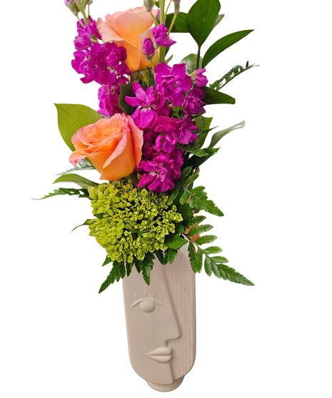 We have filled this charming "Muse" with a vibrant, asymmetric "hairstyle" of stunning flowers and lush greenery. Rich, deep purple stock stems stand tall like a cloud of creative thoughts, contrasted by velvety, sun-kissed Free Spirit roses and a bold, textured mass of lime-green hydrangea. The design is finished with architectural Israeli ruscus and delicate leather leaf fern, giving the overall composition a sense of whimsical, joyful energy.