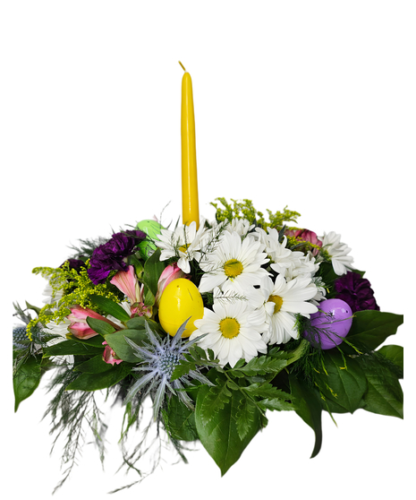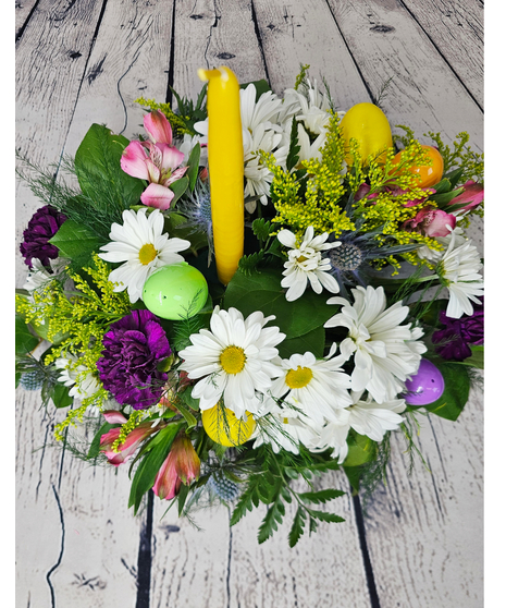 Hand-arranged daisies, carnations, and alstroemeria, includes festive, colorful Easter egg accents. Perfect for Easter Sunday centerpieces, spring birthdays, or "just because" gifts.