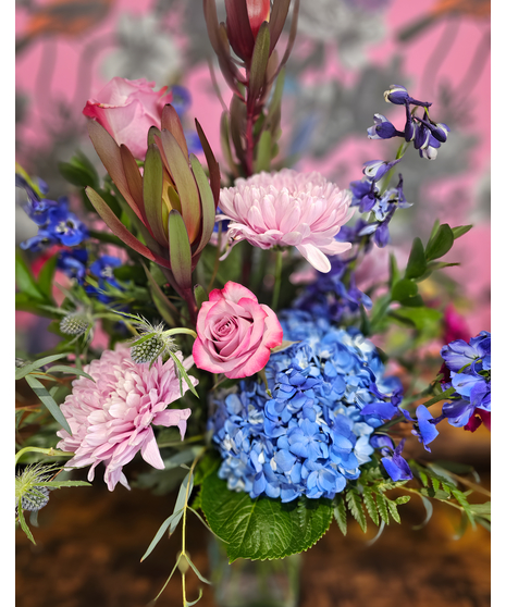 Our Lavender Twilight is a captivating blend of vibrant colors and intriguing textures, perfect for making a memorable statement. The arrangement features lush hot pink roses and soft pink cushion mums (or similar blush blooms), beautifully contrasted by deep sapphire blue delphinium and hydrangea clusters. Adding a touch of unexpected drama are the striking, maroon-tipped Leucadendron spears and the silvery, prickly accents of Blue Thistle . The entire bouquet is complemented by wispy, delicate Eucalyptus greenery, all gathered in a classic clear glass vase. This design is a modern take on elegance, celebrating an exquisite mix of blues, pinks, and fresh foliage. Accented with vibrant greenery, this arrangement creates a soothing palette reminiscent of a twilight sky just before the stars emerge.