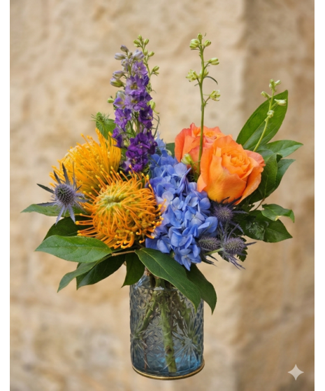 Capture the breathtaking energy of a sunrise with the Orange & Blue Horizon bouquet. This striking arrangement features a bold contrast of fiery orange roses and exotic pincushion proteas against a serene backdrop of deep cobalt delphinium and sky-blue hydrangeas. Interwoven with textured blue thistle and lush greenery, the blooms are elegantly hosted in a stunning blue cut-glass vase, whose intricate patterns catch the light like shimmering water. This design is a sophisticated tribute to a mother’s vibrant spirit and her unwavering strength—a perfect gift for the woman who has been your guiding light through every horizon.