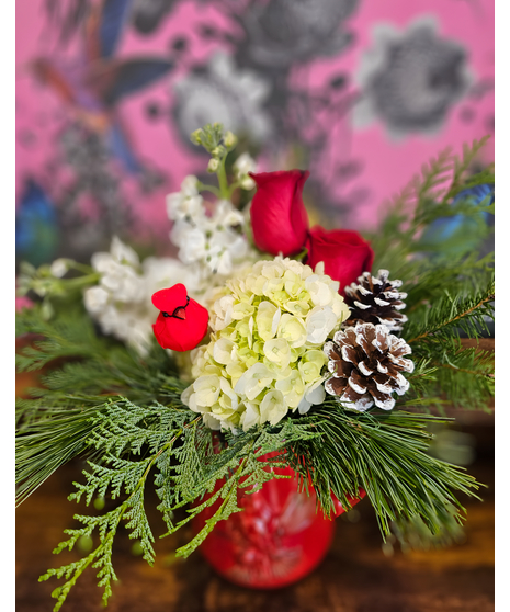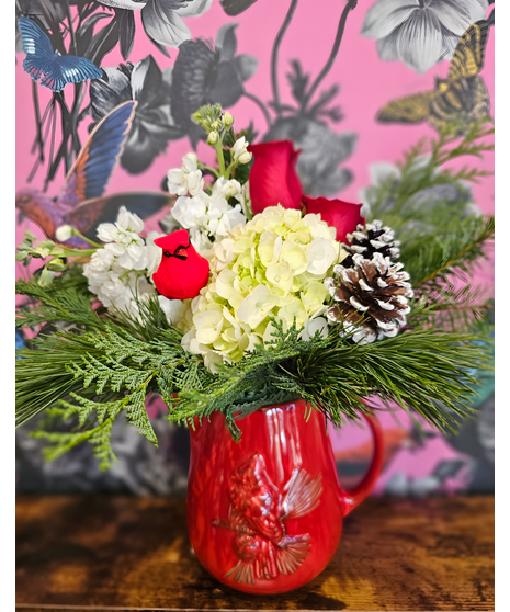 Celebrate the season with local charm! The Prescott Cardinal Christmas Pitcher is a delightful and heartwarming arrangement designed to bring the spirit of a winter woodland right into your home. This cheerful bouquet features vibrant red roses, soft white stock, and a generous cloud of creamy white hydrangea, all nestled amongst fragrant, fresh winter greens and natural pinecones. The arrangement is anchored in a beautiful, reusable red ceramic pitcher embossed with a festive Christmas Cardinal, and is topped with a charming cardinal accent.