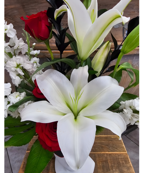 Deep Red Roses: For a love that’s as bold as a power chord. Spiky White Stock & Lilies: Adding dramatic height and "mohawk" textures to the mix. Shadowy Accents: Dark, moody foliage and vibrant green dianthus create a high-contrast look that pops against the white ceramic.