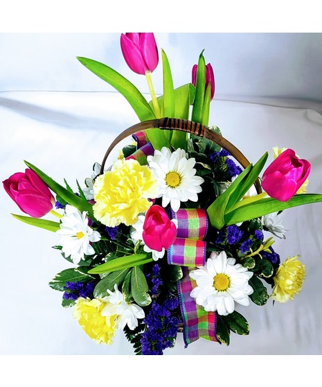 A delightful way to welcome Spring. A spring basket filled with tulips, yellow carnations, daisies, loops of spring ribbon and accents of statice and greenery. A beautiful arrangement for any Easter table.