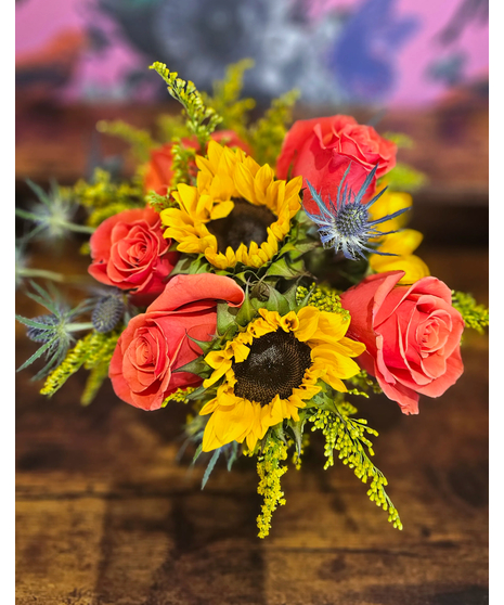 A magnificent burst of warmth! Our Sunshine & Roses arrangement combines the radiant beauty of late summer and early autumn into one gorgeous display. Featuring bold, brilliant sunflowers that look like miniature suns, accented by velvety orange roses in a rich, captivating hue.