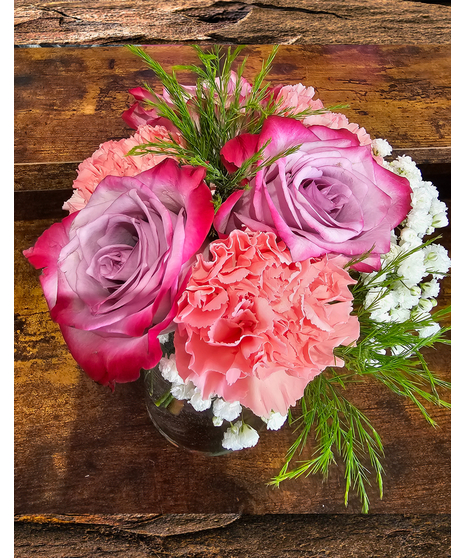 Delicate, charming, and perfectly sized, the Valentine Posy is a thoughtful gesture that speaks volumes. This petite arrangement combines classic blooms with airy textures to create a look that is both playful and romantic. Soft lavender roses and ruffly pink carnations paired with baby's breath. This is a petite arrangement